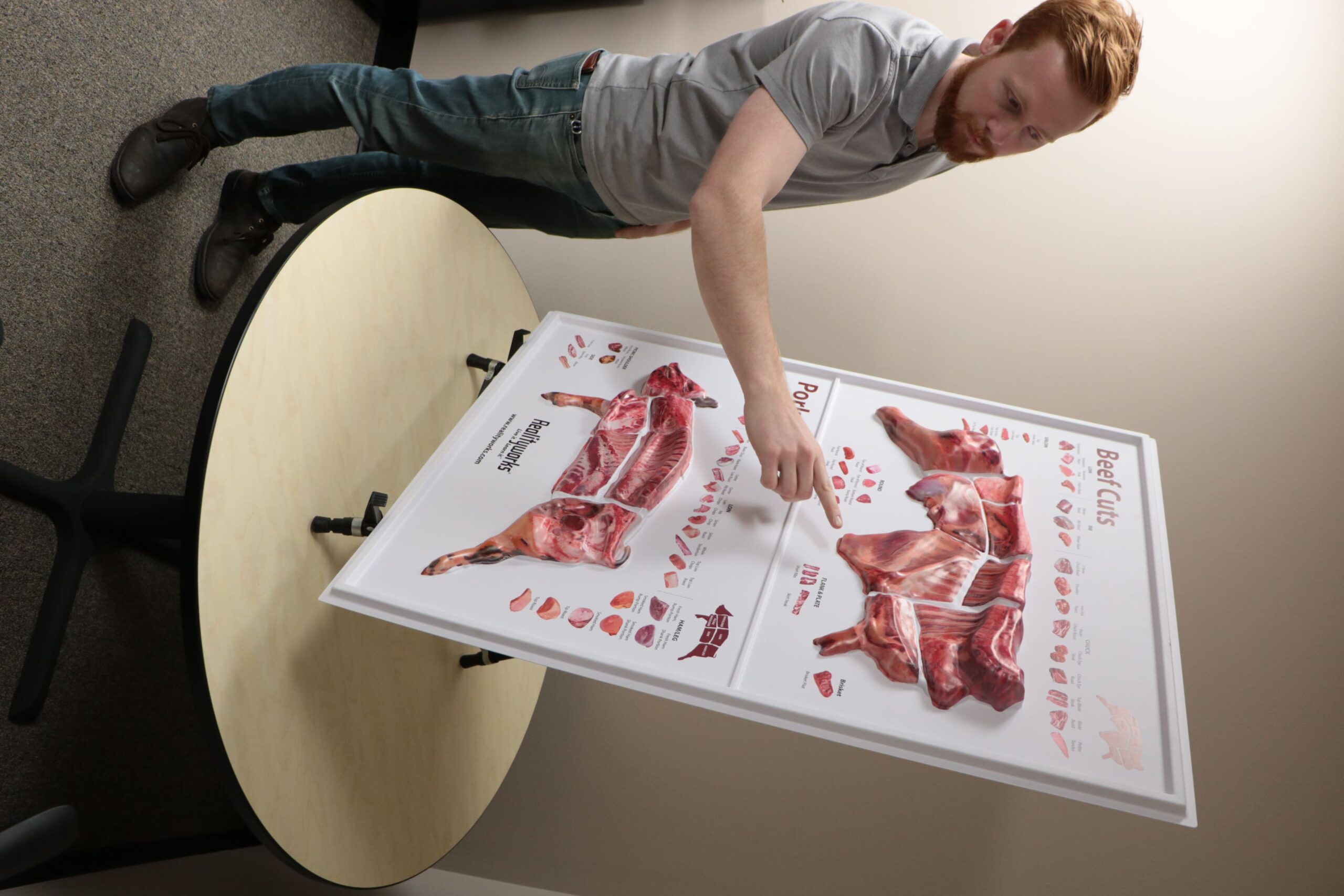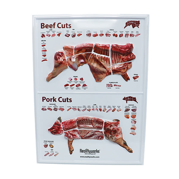 Este pôster de cortes de carne 3D de carne bovina e suína representa cortes primitivos de carne bovina e suína em detalhes realistas e coloridos. Contorna a forma do animal e representa os cortes mais comuns de carne bovina e suína.