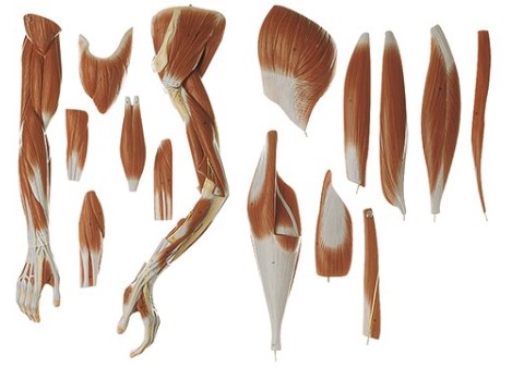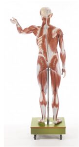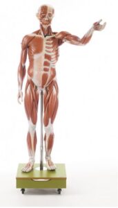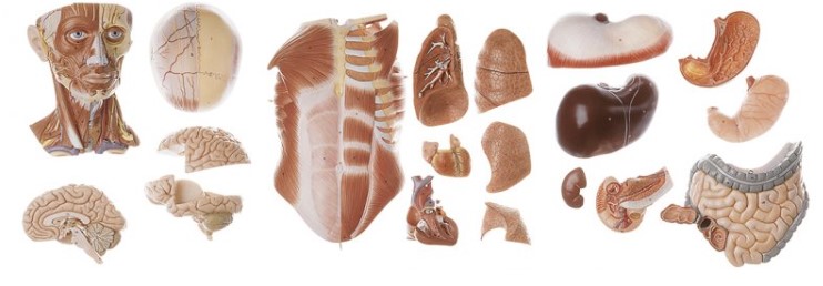 Cerca de 3/4 do tamanho natural, em SOMSO-PLAST®. Separa em 36 partes: corpo, cabeça, abóbada do crânio, cérebro (3 partes), parede torácica e abdominal, pulmão direito (2 partes), pulmão esquerdo (2 partes), coração (2 partes), diafragma, fígado, estômago ( 2 partes), intestino delgado e grosso, duodeno com pâncreas, válvula ileocecal, metade direita do rim, braço direito, braço esquerdo (6 partes), músculos da perna esquerda (8 partes). Sobre um suporte e base verde com rodízios.