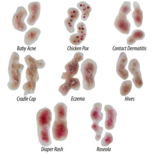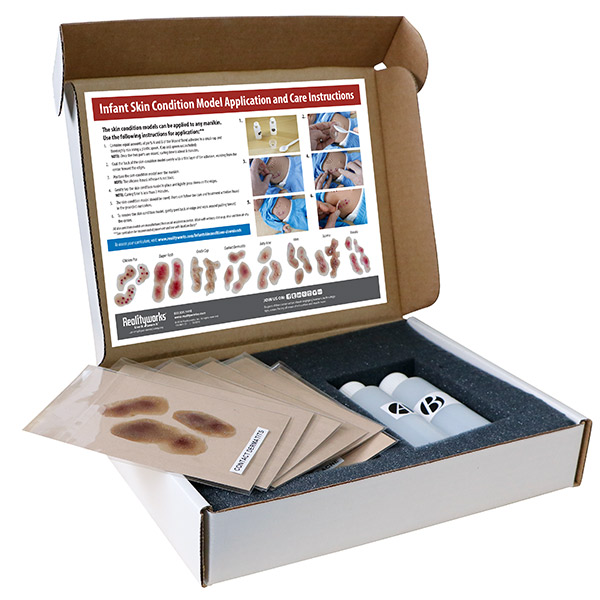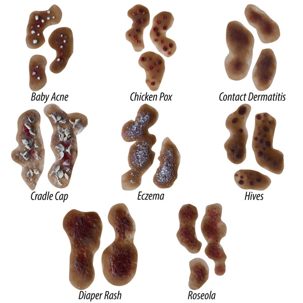 O Kit de Condições de Pele Infantil é uma ferramenta de treinamento única que inclui 8 modelos realistas de condições comuns da pele infantil. Os usuários podem aderir aos modelos à pele de manikin e examinar o tecido detalhado. Este conjunto inclui varicela, erupção cutânea, tampa de berço, eczema, dermatite de contato, acne do bebê e urticária, além de roseola. Além disso, incorpore o currículo incluído para uma experiência completa. Kits estão disponíveis em tons de pele claros e médios.
