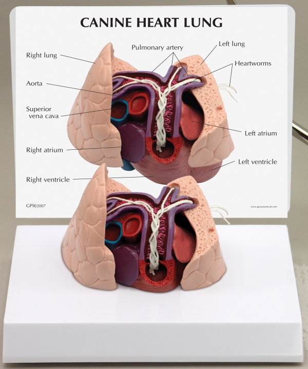 A visão cortada demonstra estruturas no coração (ventrículo direito, caminhão pulmonar, artérias pulmonares e pulmões) onde vermes cardíacos em estágio adulto são normalmente encontrados. Cartão de escolaridade incluído no modelo.