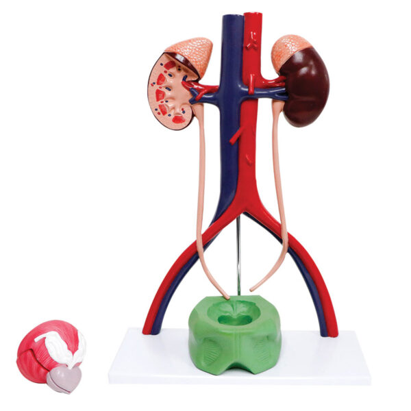 Este modelo de sistema urinário dá uma visão precisa do sistema urinário, bem como suas partes. As partes mostram os rins, bexiga, glândula suprarrenal, aorta abdominal, veia cava inferior, uretra e bexiga.