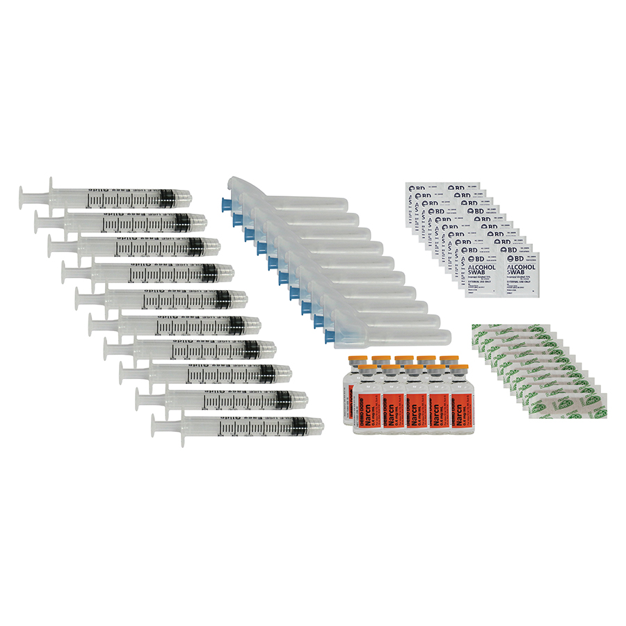 O Pacote de Fornecimento de Injeção de Naloxona reabastece o pacote de suprimentos do Kit de Treinamento naloxona.