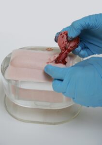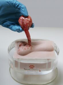 O modelo de orquictomia canina (neutra) do Rescue Critters apresenta testículos realistas e epidídicos testiculares, juntamente com os vasos sanguíneos testiculares e dutos espermáticos que precisam ser removidos durante o procedimento. A tunica vaginalis também está presente.