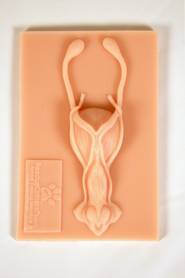 Esta ferramenta instrucional permite que os treinadores expliquem visualmente as várias partes do órgão reprodutor canino feminino antes dos estagiários trabalharem no modelo de ovariohisterectomia.