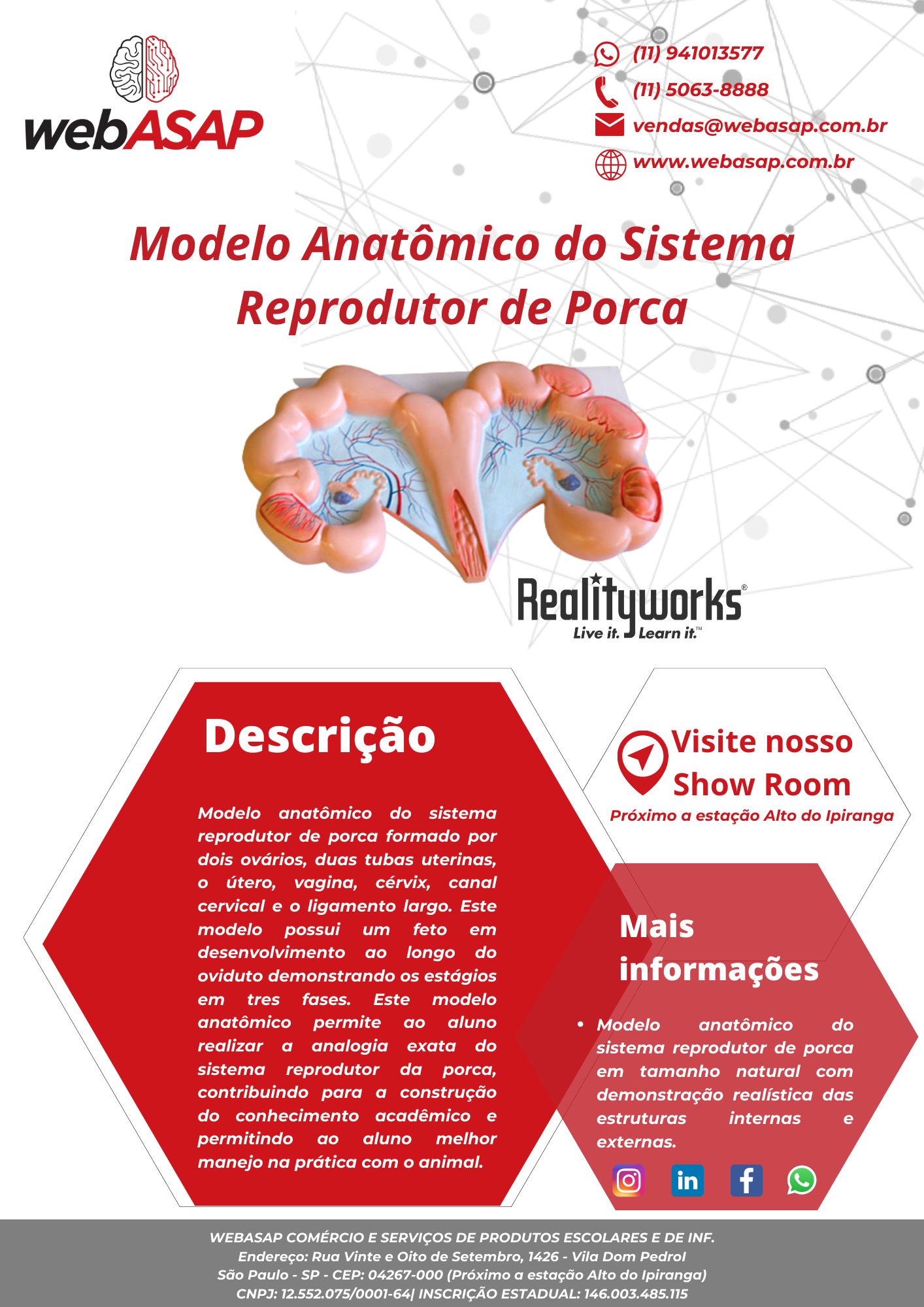 Modelo anatômico do sistema reprodutor de porca formado por dois ovários, duas tubas uterinas, o útero, vagina, cérvix, canal cervical e o ligamento largo. Este modelo possui um feto em desenvolvimento ao longo do oviduto demonstrando os estágios em tres fases. Este modelo anatômico permite ao aluno realizar a analogia exata do sistema reprodutor da porca, contribuindo para a construção do conhecimento acadêmico e permitindo ao aluno melhor manejo na prática com o animal.